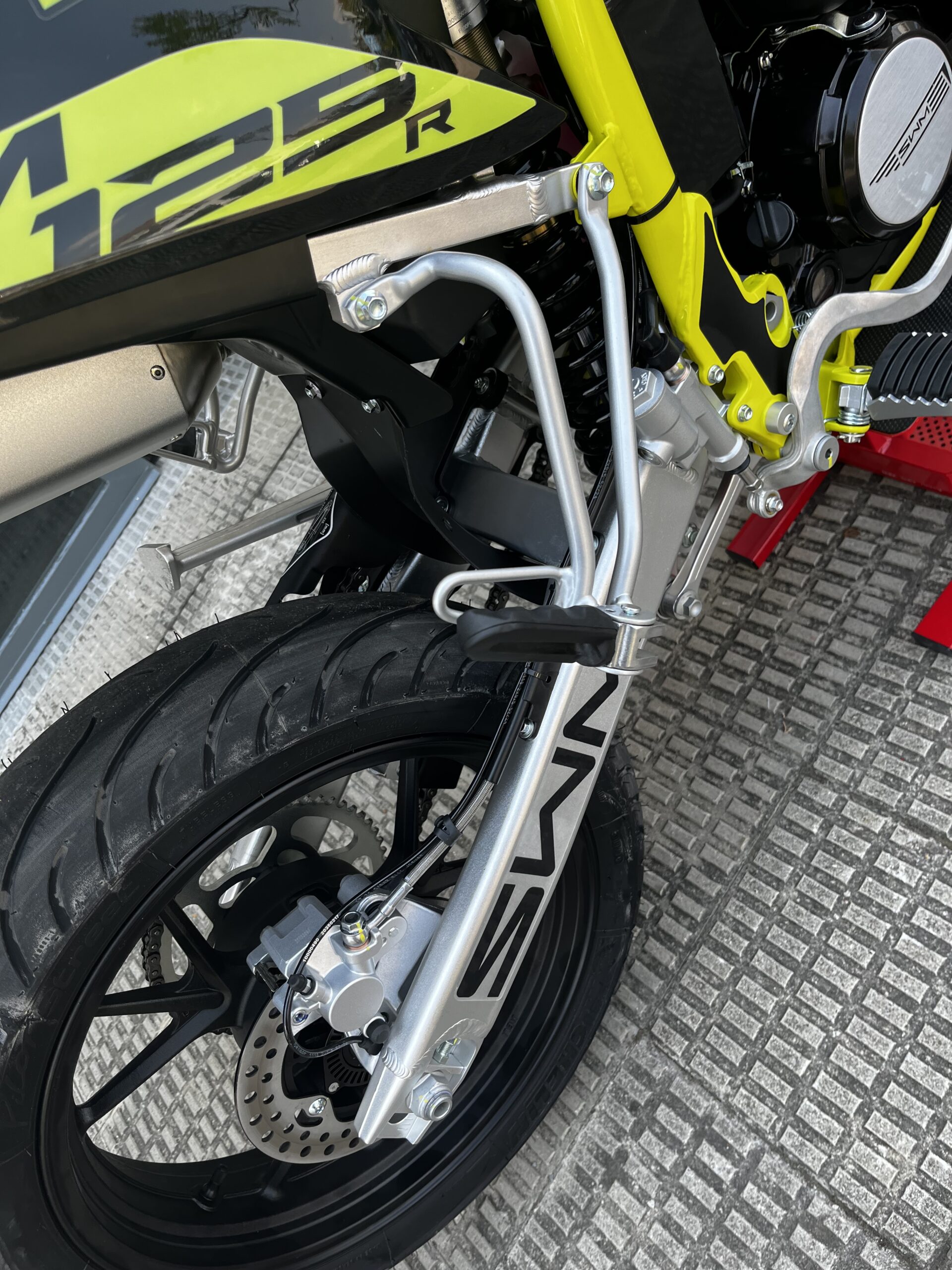 Habiendo conservado una configuración de carreras, el SM 125 R tiene un sistema de frenos equipado con ABS y está aprobado para su uso con un pasajero.